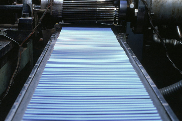 3 切りそろえるねり上げられた原料(げんりょう)を芯(しん)の太さに押し出し、20センチほどに切りそろえます。